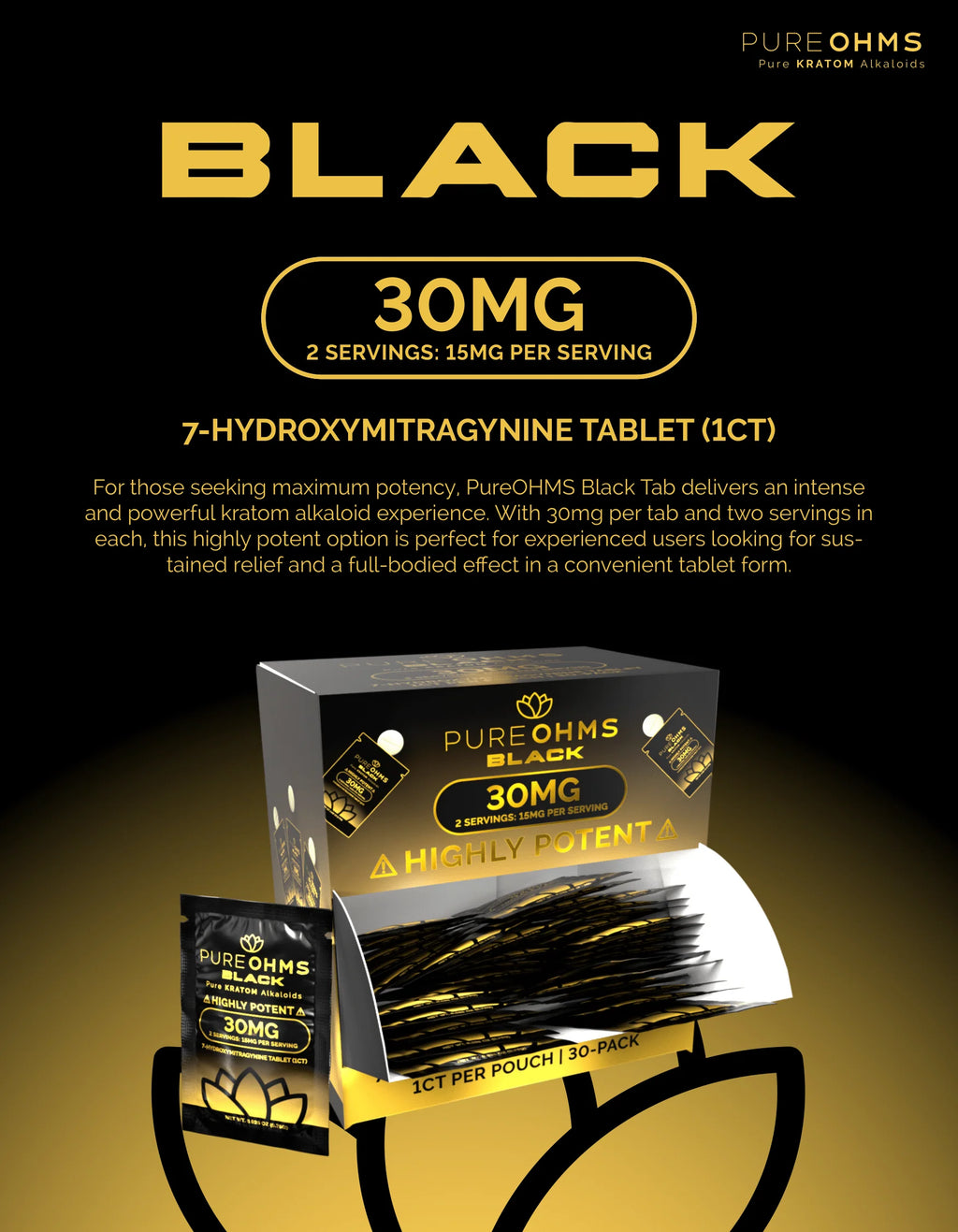 Pure OHMS Black 30mg Kratom 7-Hydroxymitragynine 1pk Tablet 30ct Display Box